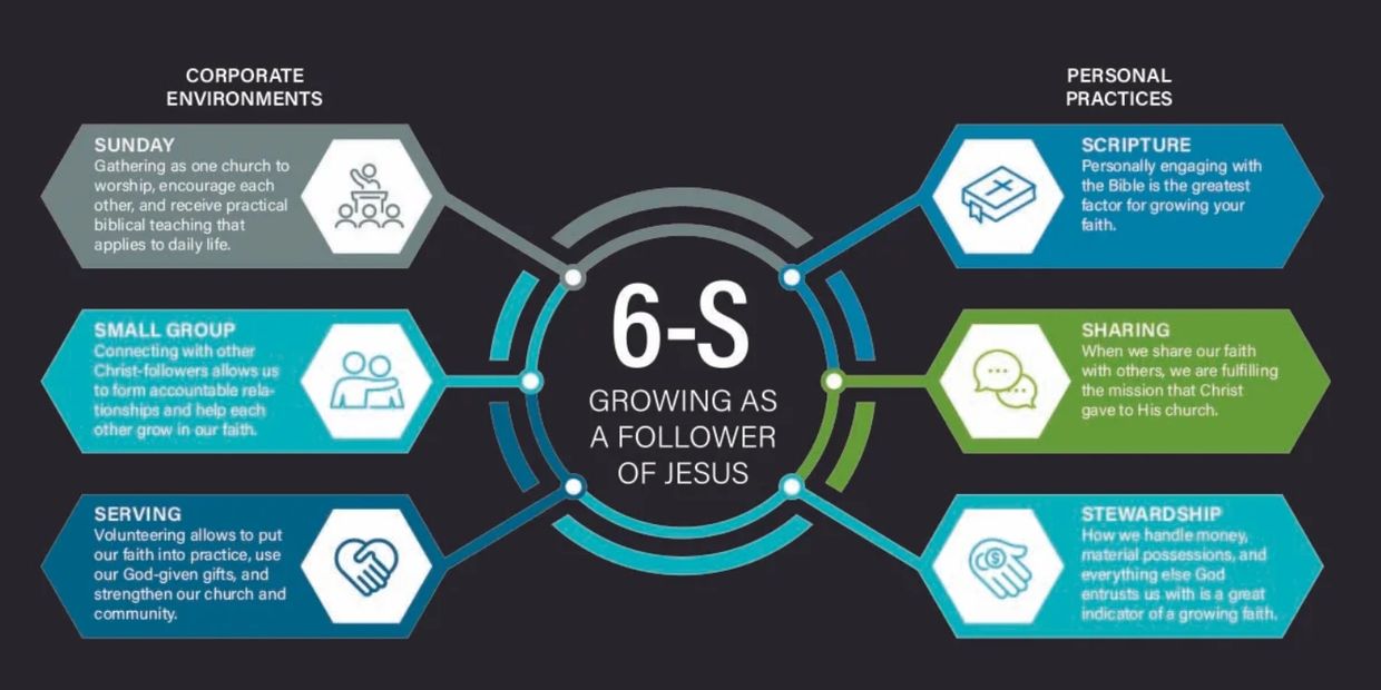 In the graphic above, you can see what each of those “S” words are. On the left are three ENVIRONMENTS (Sunday, Small Group, Serving) that we believe every Christian should plant themselves in. On the right are three key PRACTICES (Scripture, Sharing, Stewardship) that will cause a Christian to grow in their faith. Together, these 6S’s can bring transformation to someone who wants to follow Jesus.